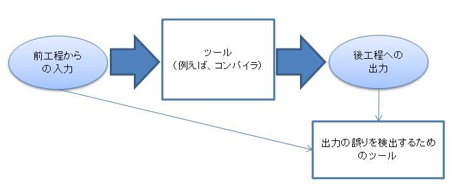 まずは、これから認定しようとしているツールについて着目します。たとえば、コンパイラだったとしましょう。すると、前工程からの入力=ソースコード、後工程への出力=バイナリコード になります。