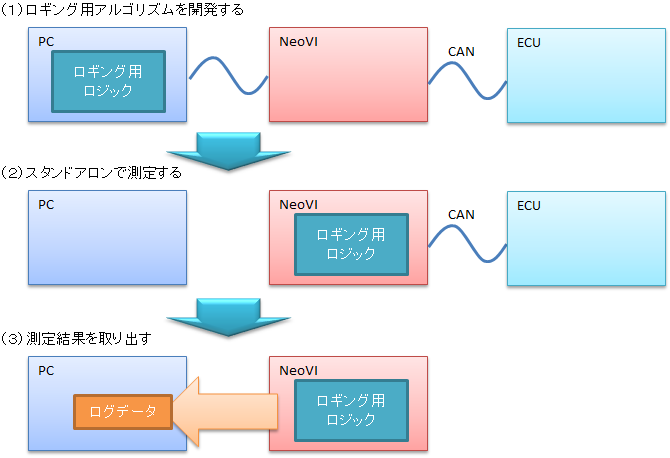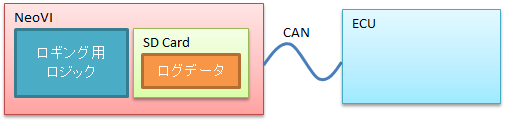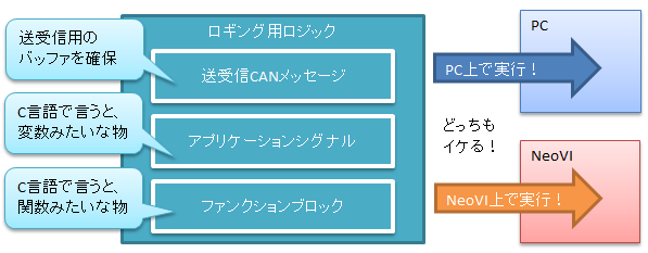 ロギング用のロジックはPC上で実施し、NeoVIは単なるCANインターフェースに徹することで、比較的簡単にロギング用ロジックを調整できます。