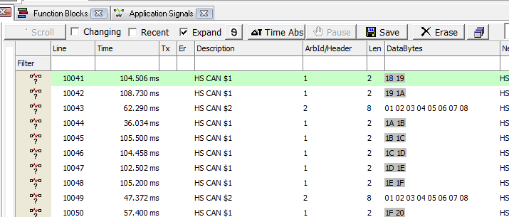 このVSBファイルは、VehicleSpyから見ることができます。メニューの「File」>「Review Buffer…」をクリックし、先ほどのVSBファイルを指定すると、次のようにロギングしたデータが見られます。