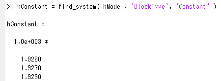 手順2:MATLABコマンドウィンドウにて、Constantブロックを検索し、そのハンドルを取得します。