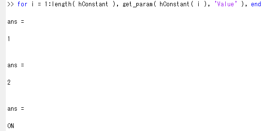 >> for i = 1:length( hConstant ), get_param( hConstant( i ), ‘Value’ ), end