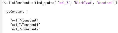 >> listConstant = find_system( ‘ex1_7’, ‘BlockType’, ‘Constant’ )