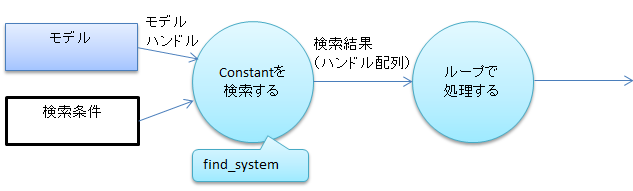 さて、その「基本形」ですが、find_systemコマンドの引数に「検索条件」を渡すと「検索結果(ハンドル配列)」が返ります。その「検索結果」を「ループで処理」するという流れを持っています。