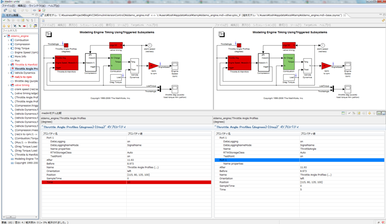 medini uniteは、差分表示はとても秀逸です。通常のテキスト用Diffとほぼ同じ使用感です。一方、マージ作業は、「現在のバージョン」「過去のバージョン」のいずれかを採用するか?の2択になります。この方式は、「どの部分がマージ済みか?」を確認しやすいのが利点ですが、2択では済まない場合には対応できません。そのため、差分表示させつつ、直接Simulinkを起動してマージ作業を行った方が良い場合もあるかと思います。