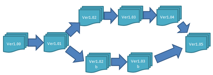 途中で枝分かれしているのは、別々のリポジトリに分かれて、それぞれ個別にコミットしていたためです。そして、ある程度作業がまとまったところで、マージしてVer1.05という1つのバージョンに戻っています。